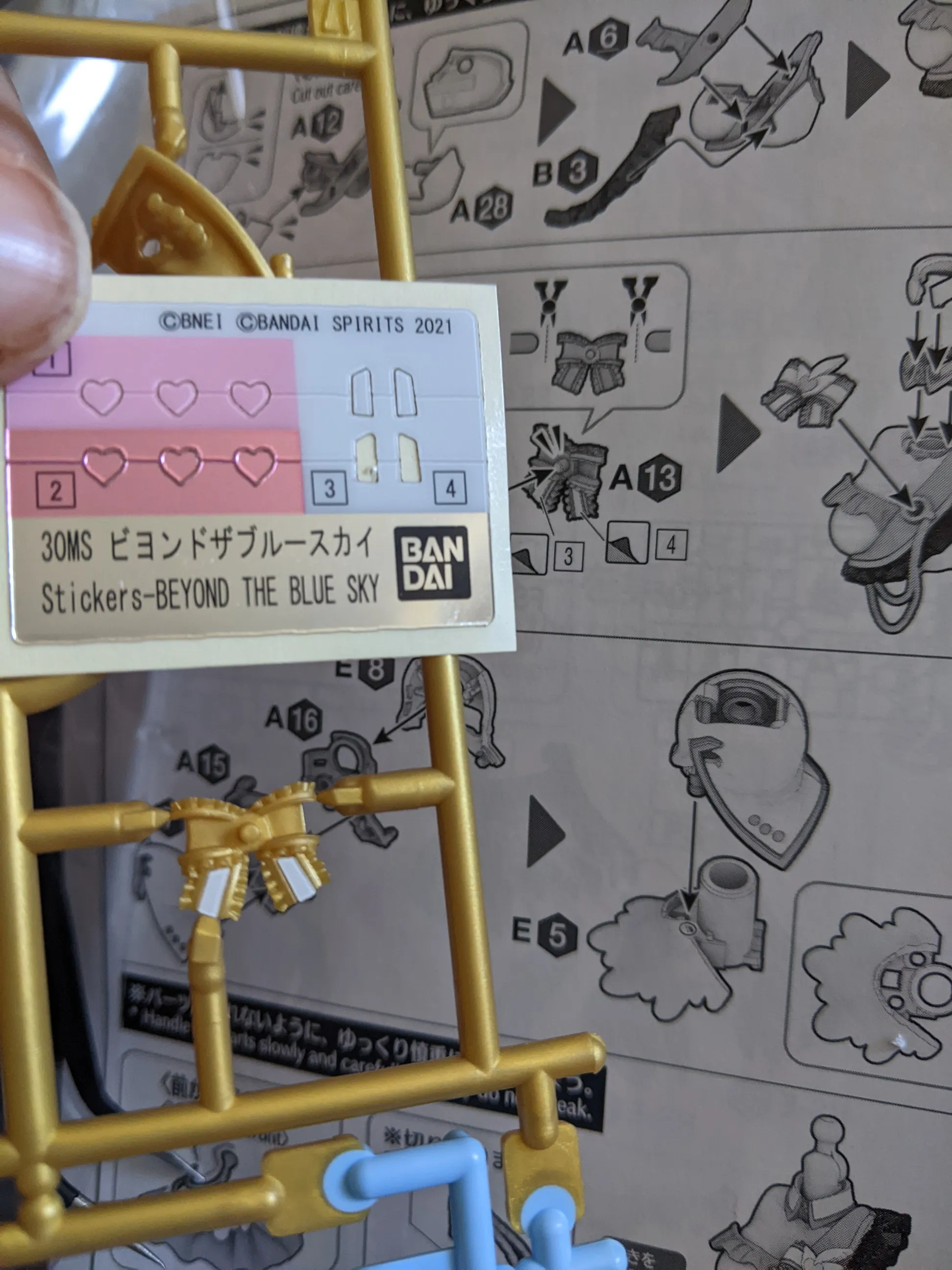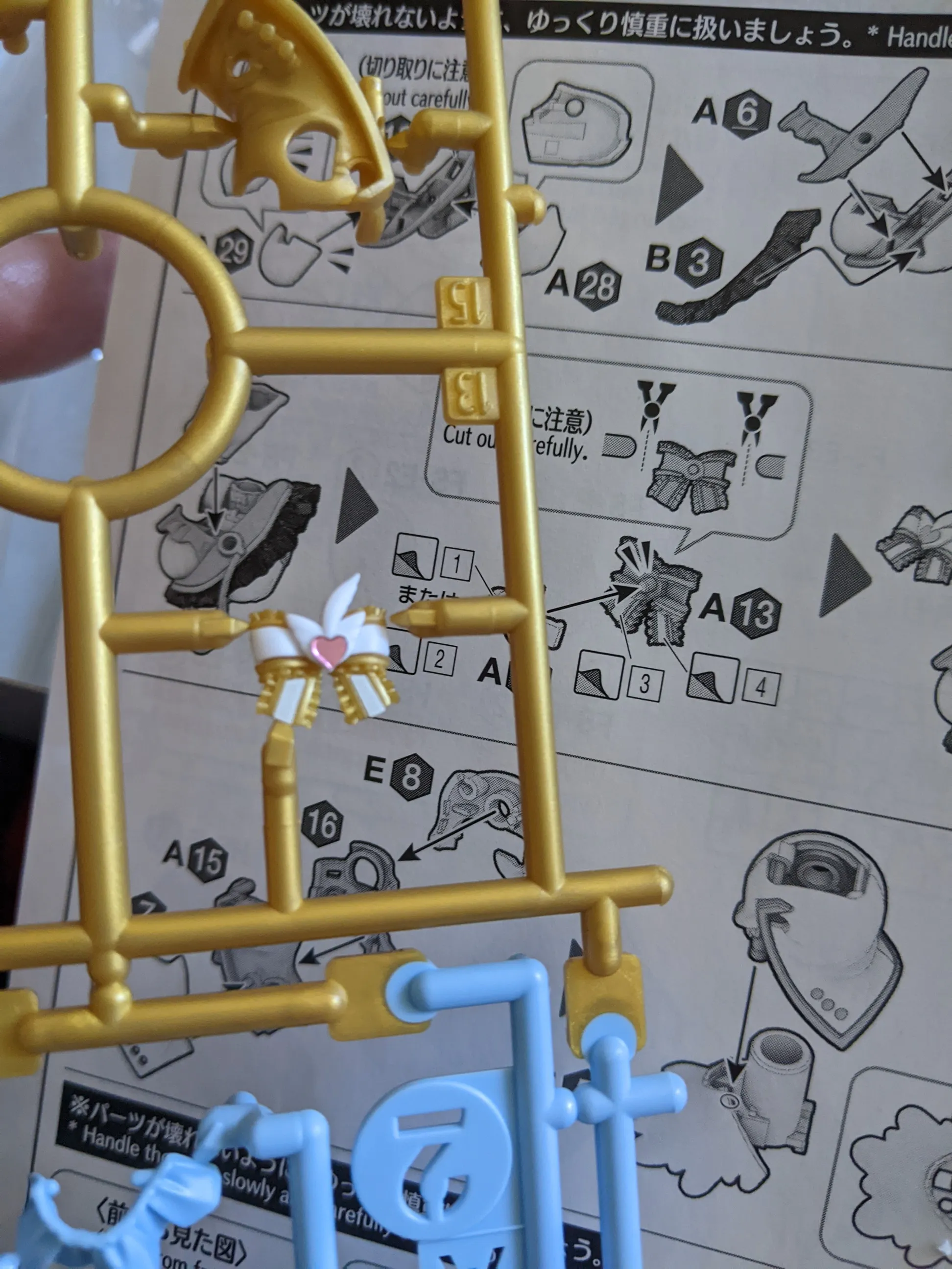 While her hair and face are detailed, those are about as easy to piece together as her arms and legs. It's the torso and skirt that's challenging due to how elaborate her outfit is. First, the upper part of the torso is challenging due to the gold accents and the translucent, black glitter plastic designed to act as frills along the left shoulder. It isn't too difficult to arrange the initial parts. However, the gold chain attaches to a broach with a heart in the center, and you need to arrange stickers onto that. My recommendation is to keep the gold, back part of the ribbon and white upper part attached to the runners, placing the stickers on them with teasers first, before popping them out to assemble them and stick them onto her chest. The good news is, once you do have the ribbon assembled, it is pretty easy to get it attached to the chain and pressed into place.
