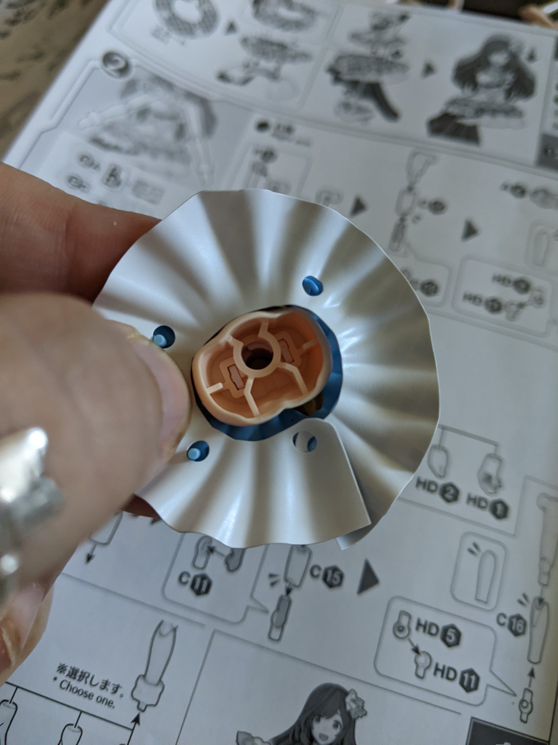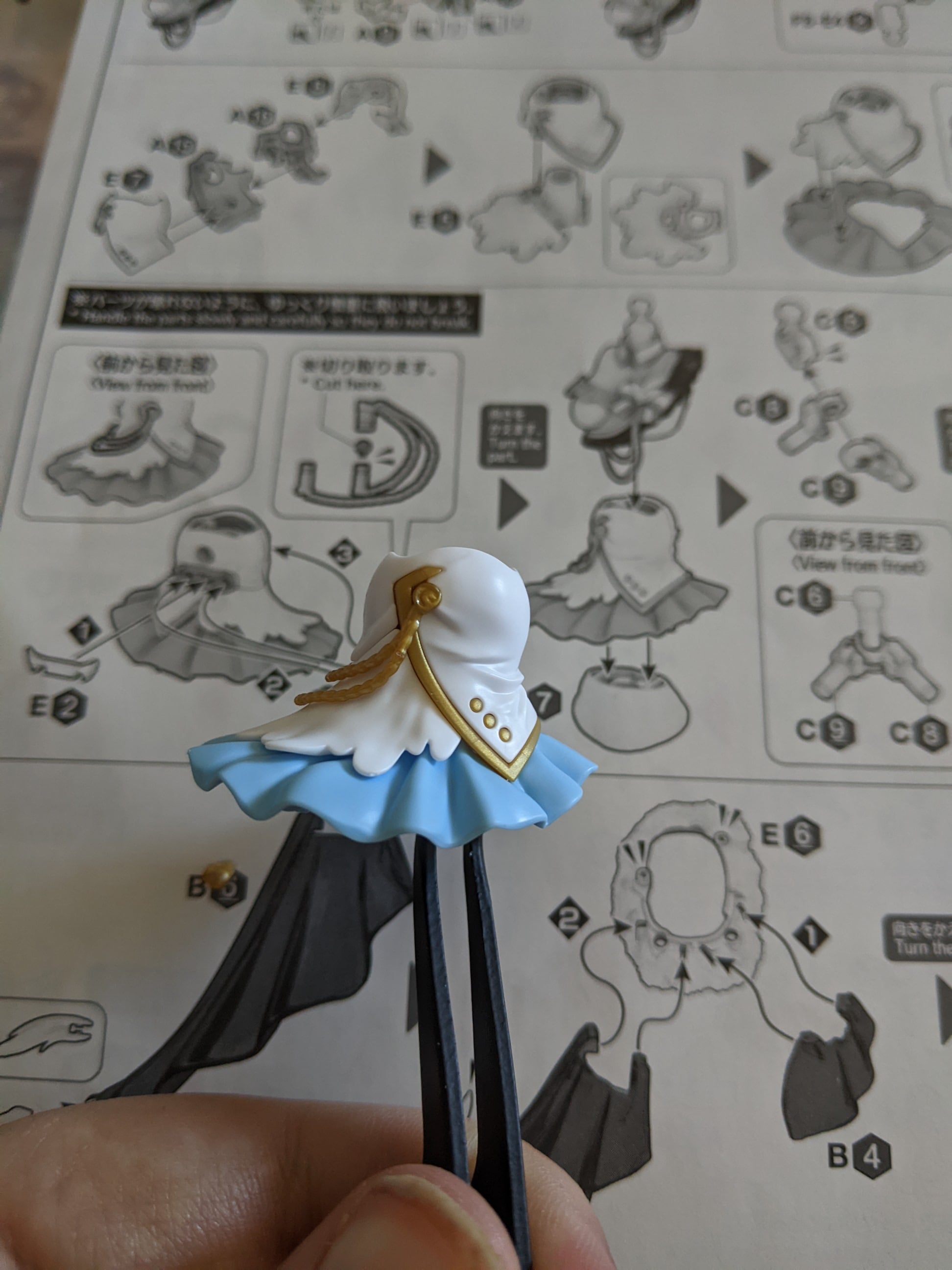 The skirt and lower half of the torso are the next extremely detailed part of the Kogane Tsukioka The Idolmaster: Shiny Colors 30MS model kit. There are gold accents that need to be pressed into the lower part of the torso above the skirt of her dress, and there's another extended black, translucent, glitter train that gets attached to the back. While that piece does feel a little more brittle than the other plastic parts, it's still sturdier than I expected! But the real challenge and issue here comes with a bit of plain "fabric" that is supposed to go between two parts of the skirt to enhance the layered effect. It needs to be curled in such a way that it hits four pegs on the underside of the one layer, then connect to the part below it. It is so difficult to get this to line up, due to the awkward design and ruffled edges on the bottom-most skirt part. Then, when pressing it together, it's a little fiddly! There are so many thin, delicate parts that I was worried something might snap here.