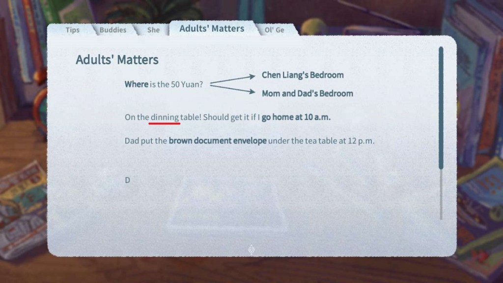 While A Perfect Day technically counts as a visual novel, it's closer to a puzzle game than anything. You have to calculate the perfect order of doing things so that you can clear all of the wishes that Chen Liang has for the day. As well, you have to make sure you have the right items and activities in your drawer when you start the time loop. The alternative is remembering where and when you get everything. In that sense, it's very similar to how people used to play video games back during the 90s. That was before my time. But even in the early 2000s, I was drawing maps and writing down notes to remember things.