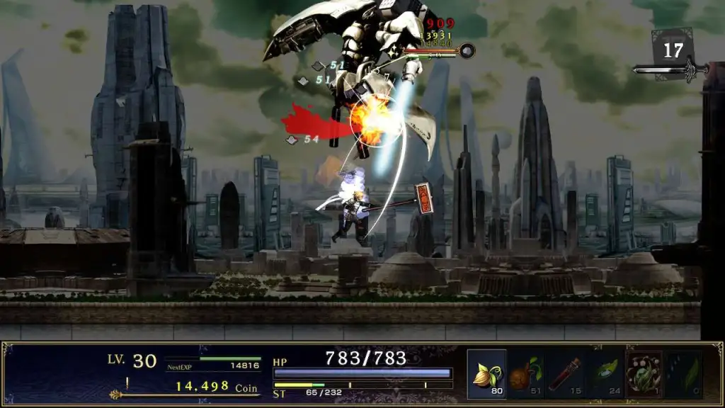Moving on to something a bit more positive, the gameplay is far more consistent than the game's writing. Astlibra Revision is divided into several chapters, each one having its own level to explore that can be revisited while in the main hub. Combat in Astlibra Revision will feel familiar to those that have played some Vanillaware 2D action games, and it is especially similar to Muramasa: The Demon Blade. The protagonist starts with a basic attack combo. Unlocking skills and finding technique scrolls adds more variations to combat. Some of these include launching the weapon in an arc like a boomerang, performing a shield bash that deals high stun damage if one is equipped, and performing a quick flurry of aerial strikes that deals massive damage.