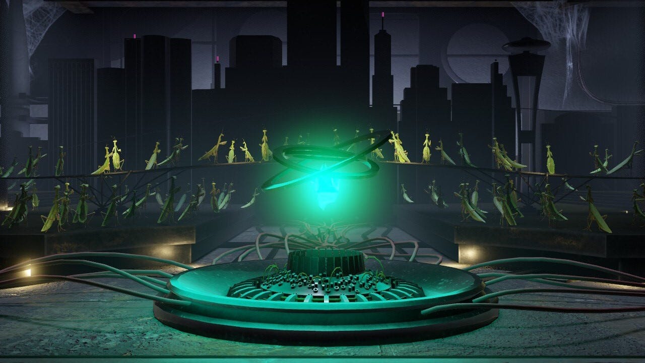 Rock Paper Shotgun Latest Articles Feed Wednesday, August 23, 2023 10:32 AM Aperture Desk Job is full of unexplained details. Right at the start, as the camera pans down from the retrofuturist reception area to your lowly desk-based workstation, we see all manner of orange tubes, future Grady cores being trained to fool captcha image tests, a giant chicken, and what appears to be the origin point of Half-Life's ammo boxes being constructed. But there's also a pointed shot between the floorboards, showing us a pair of green praying mantises fumbling around over some electrical wiring and a rogue lightbulb. On its own, this mantis scene is no stranger than anything else we've witnessed in the last 30 seconds. But as your journey through Aperture goes on, things start getting really weird, really fast. Over the course of the next half hour, we'll see these mantises discover electricity, evolve into a society of tiny house-dwelling insects with their own carriages and courtship dances, and eventually a futuristic civilization who have mastered flying saucers and created an eternally self-sustaining power source. All in the same time it takes your supervisor core Grady to come up with a rudimentary prototype for what will eventually go on to become Portal's creepy turret. But you, yes you, CHARLIE, had to go and ruin it all by dropping the giant metal head of corporate mega-bastard Cave Johnson through the floorboards. What might those mantises have become, if they hadn't been so rudely crushed by your rampant disregard for their wellbeing? |