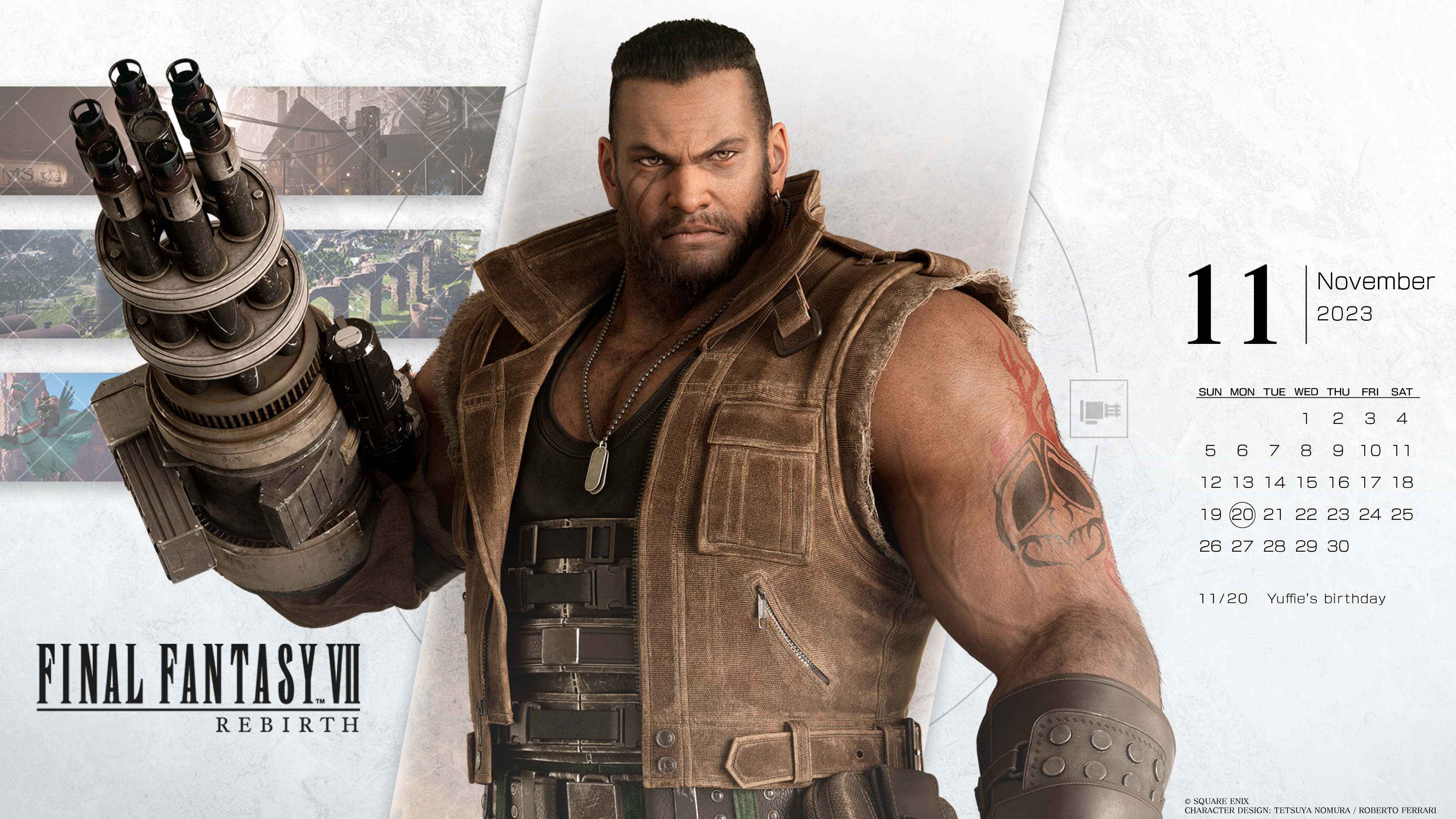 Every month, Square Enix releases mobile and desktop Final Fantasy VII calendar images. The four November 2023 FFVII calendar images feature Rebirth character art ahead of the new game's debut.