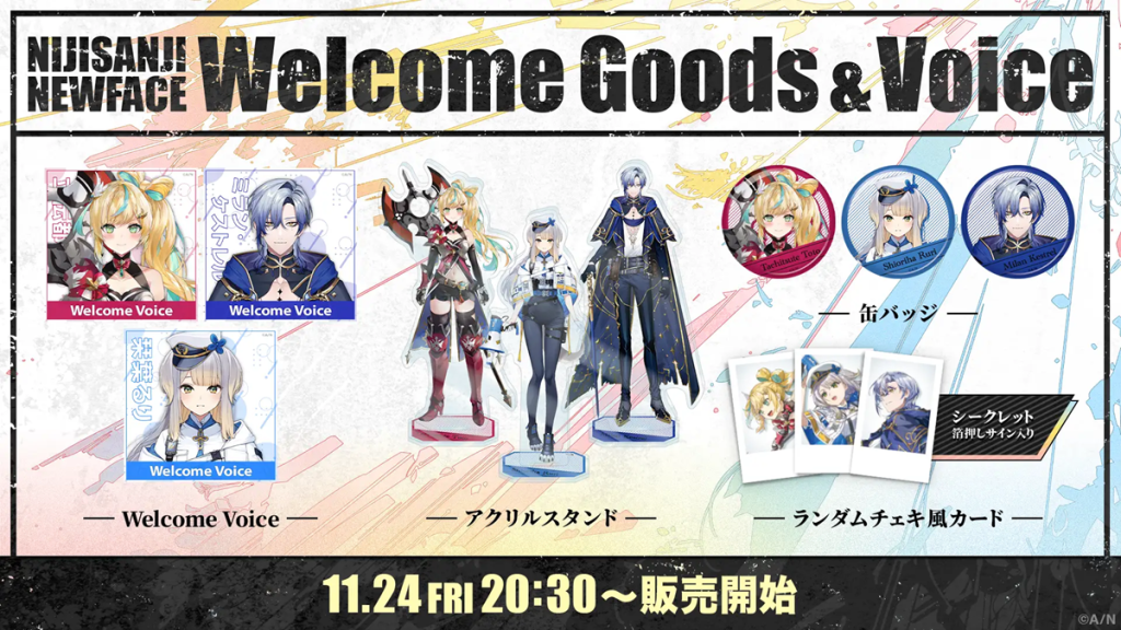 Furthermore, the distribution of official welcome goods and voice packs for Toto, Ruri, and Milan will commence on November 24, 2023. They will be available for purchase from the company's official store. The items being sold include Welcome Voice packs, acrylic stands, pin badges, and random Polaroid-style cards. The cards also include secret foil-stamped autographed versions. Each voice pack includes an "Introduction," "Good Morning," and "Good Night" track.
