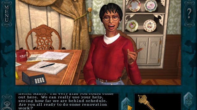 Rock Paper Shotgun Latest Articles Feed Thursday, March 21, 2024 10:56 AM It's been a while, but I'm finally back on the Nancy Drew mystery game train. Choo choo, next stop: San Francisco! This has pleasing synergy with my real life, because I'm currently watching through Monk, a popular detective show also set in San Francisco. Mr. Monk would be displeased by the house Nancy finds herself in this time, which is a mansion being converted into a B&B. The owner, Rose, is working on a shoestring budget and has decided that the best player to add to her renovation team is a young-adult woman who's a friend of a friend. It all makes sense! Nancy Drew: Message In A Haunted Mansion is the third game in the Nancy Drew mystery series of puzzle games, and boy does the weird first-person fixed camera work against you here. It's also a more disappointing plot than the previous games, but it adds in a new time system that, much like Stay Tuned For Danger, is an ambitious move - and in this case I think it sort of works. It's a mixed bag, is what I'm saying. |