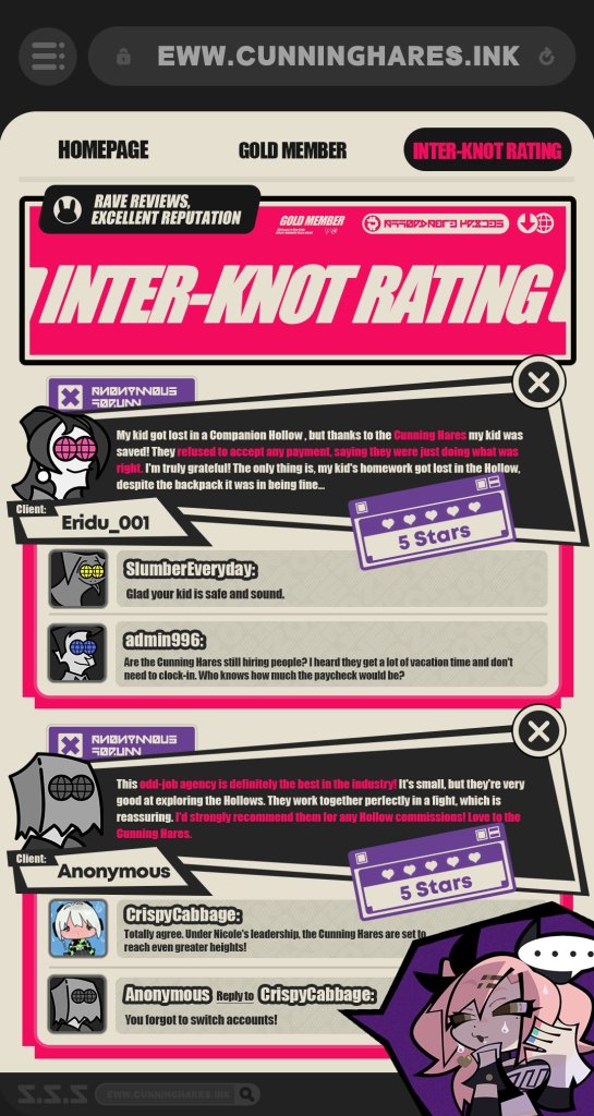 Here are the latest Cunning Hares "website" images. The main page is the initial ad highlighting how the urban investigation team can handle all sorts of jobs at "fair prices." The second image reviews from past customers. One has a comment from "CrispyCabbage," who appears to be the member Anby, praising Nicole before being called out for commenting on that while being logged in. The third page has stylized portraits of all four members of the team.