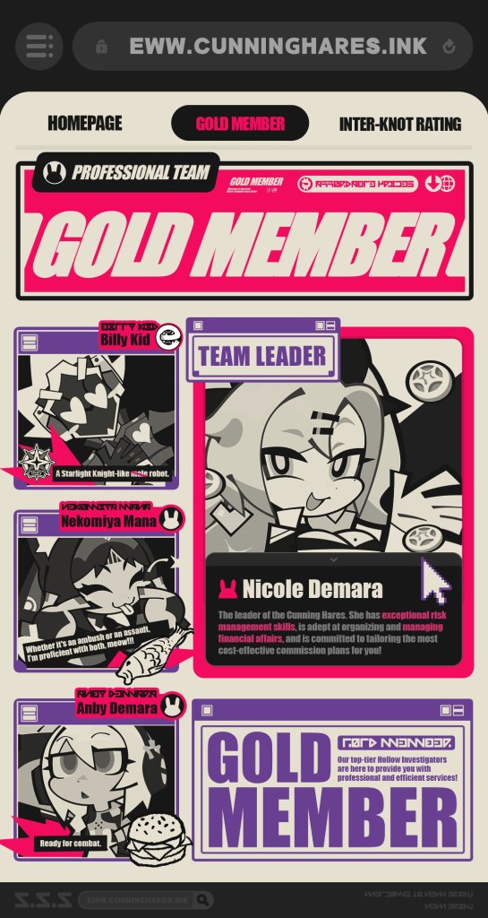 HoYoVerse took to social media to offer more insight into the Zenless Zone Zero Cunning Hares characters via a fake "website." As a reminder, in-game the four people tied to that faction are Nicole, Anby, Billy, and Nekomata.
