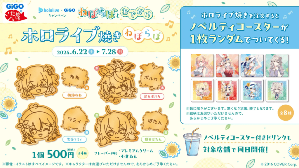 The new hololive NePoLaBo merchandise and menu lineups will be available at GiGO outlets across Japan from June 22, 2024, to July 28, 2024.