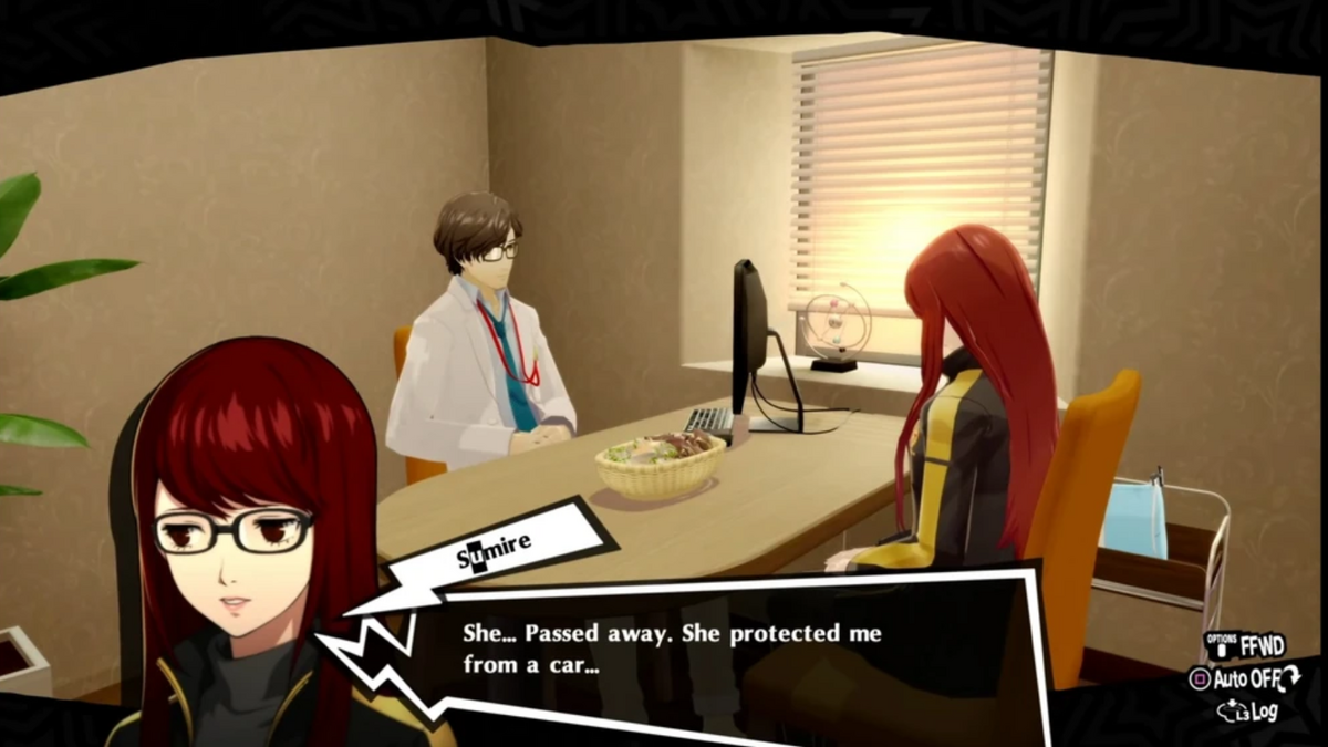 "Violated" is a strong word. But it's the closest to the severe ick I felt during the flashback to Maruki using his powers on her. The way that Sumire went from borderline suicidal to bright and peppy in a heartbeat was so creepy. No amount of the game trying to convince me it was good will get me to accept that. It's not just the forced erasure of Sumire's identity. It's the fact that Sumire hated herself even when Kasumi was alive, and Maruki's idea of helping her inadvertently created the internal narrative that she was the one to die. That Kasumi did deserve to be the one to survive. Sumire is so much better than me because if my therapist did that to me, I wouldn't be saying anything positive about him at all, dead girlfriend be damned.