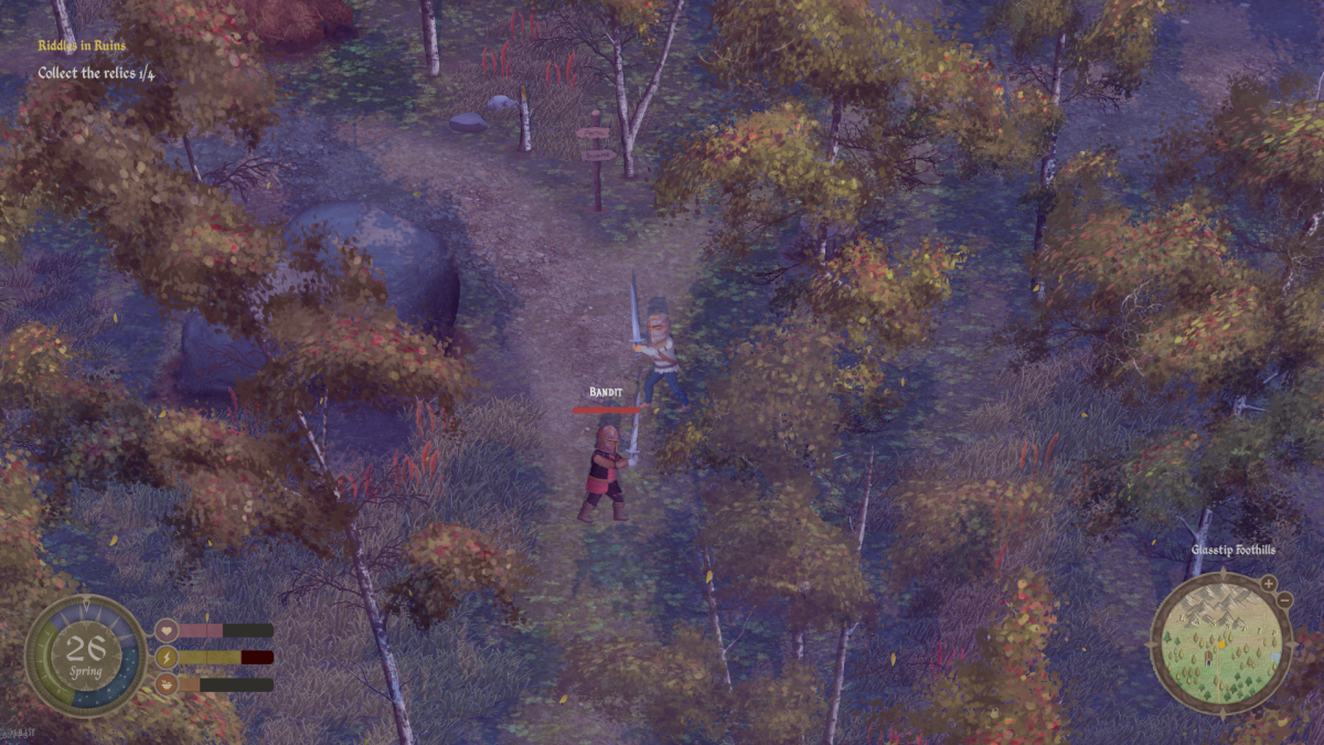 And it's here the art style actually starts to hurt the game. While it does bring a distinct, almost storybook-style aesthetic that reminds me of Wildermyth, it also makes the game world appear very flat which makes it difficult to judge distances for attacks and dodges. Combine that with a fairly close player camera, and the environment ends up feeling quite same-y and indistinct, as one small copse of trees blends into another when there's no roads or buildings to orient yourself around.