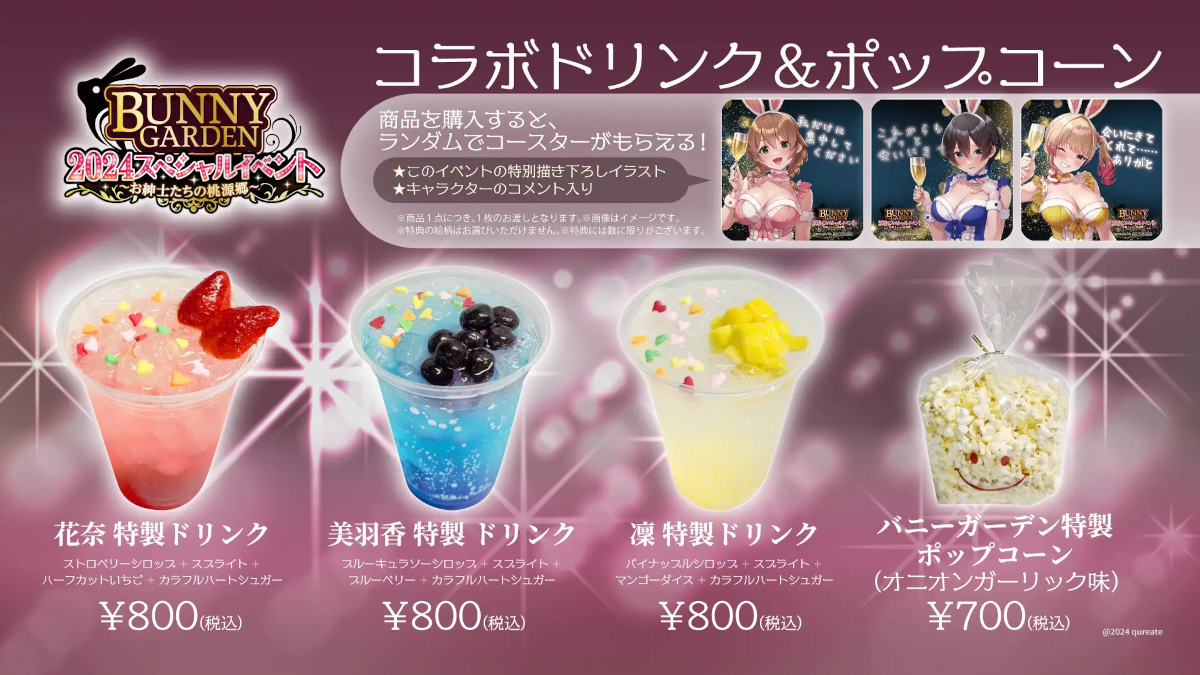 Other than merchandise, the event will also have sales of onion garlic-flavored popcorn at ¥700 per pack and character-themed drinks that cost ¥800 each. All three drinks will be made with Sprite and colorful heart sugar, but the remaining ingredients will differ for each character. The staff will use strawberry syrup and half-cut strawberries for Kana's drink, Blue Curacao syrup and blueberries for Miuka's, and Pineapple syrup with mango dice for Rin's.