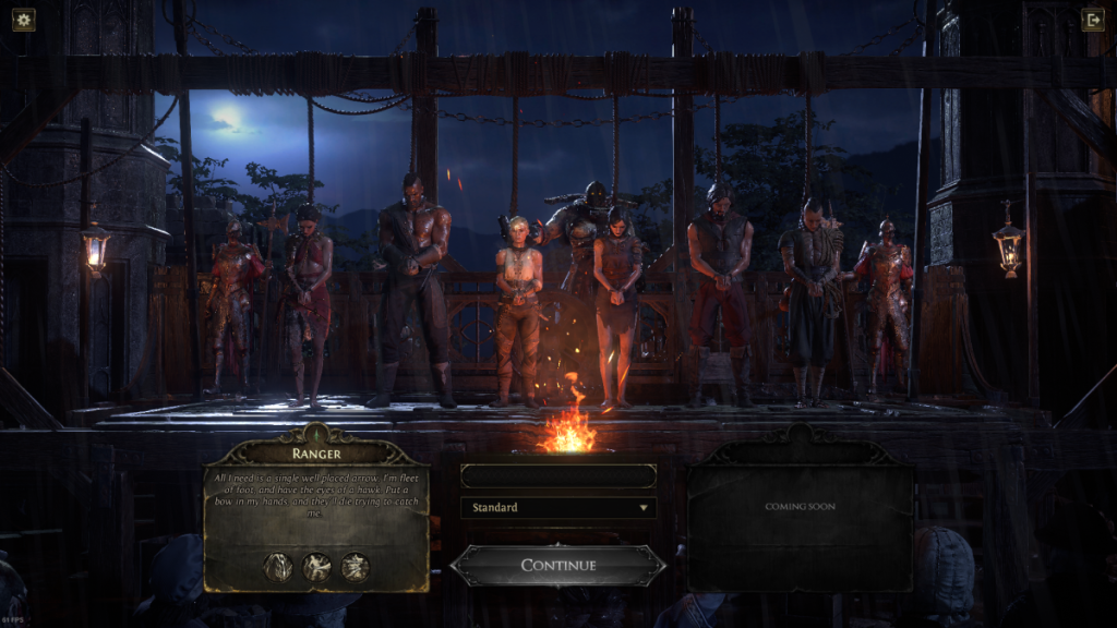 Once in the game proper, you'll be hit with a character selection screen that lets you know that same gritty Path of Exile tone is back in full force. Whichever class of character you don't choose is immediately executed by hanging. Your chosen character miraculously escapes, and it's on to fighting undead in the wilderness like old times, complete with the first living person you meet being immediately torn apart by a zombie.