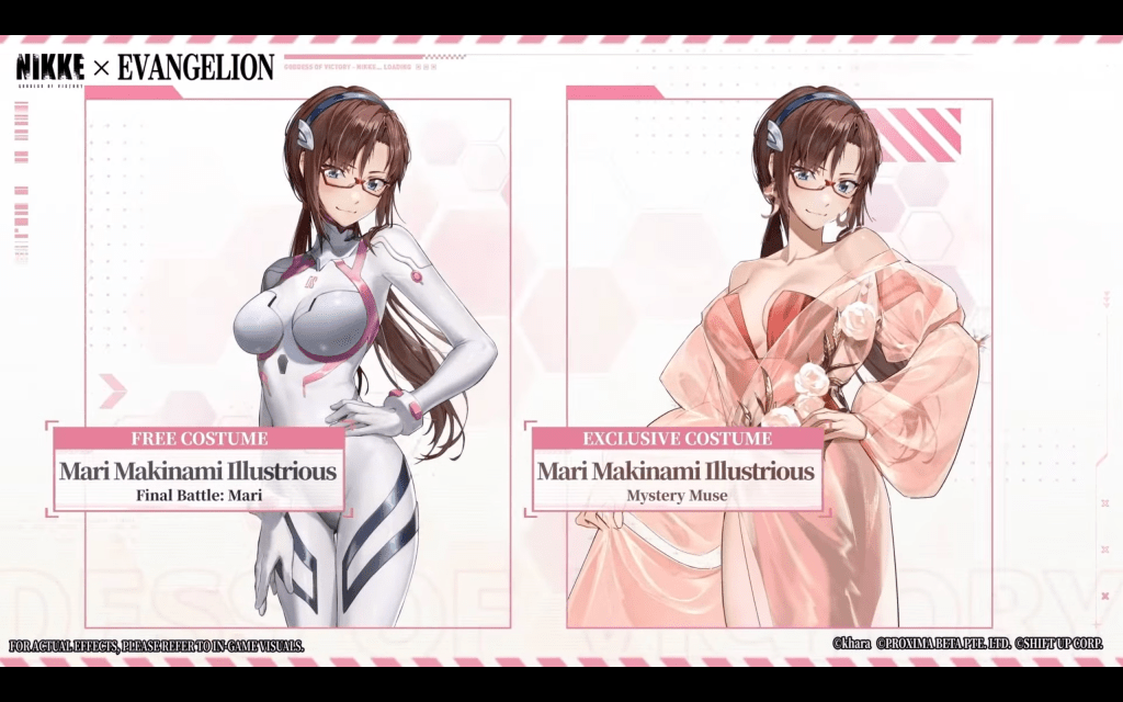 There are also going to be six new costumes. Four are for the new versions of Asuka and Rei. The other two are for Mari. The free outfits will be Final Battle: Asuka for her new alt, Miss Lookalike from Village-3 for the new Rei unit, and Final Battle: Mari for Mari. The exclusive costumes are Mystery Muse for Mari, Soul Connect for the new Rei character, and Ocean's Lament for the new Asuka.