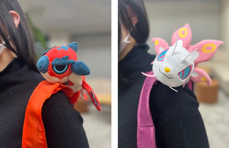 Each plushie's overall length will range from around 19 to 26 centimeters (7.48~10.24 inches). However, their undersides will host an extendable 63cm(~24.8in)-long eco-bag. When the owner hangs the eco-bag over their shoulder, the plushie will also look like clinging to them.