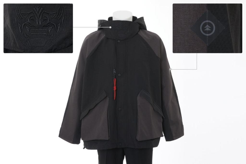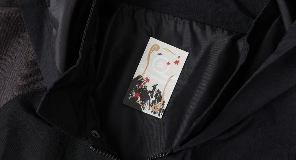 The Jin Sakai Model Jacket features a dark color scheme based on Jin's armor from Ghost of Tsushima. The collar has Jin's Ghost mask design embroidered on it and can be worn up or removed from the jacket. The Sakai Clan's emblem is sewn onto the left arm sleeve. The front pocket zipper has a red knotted charm based on the ropes founds on Jin's Ghost armor. The inside of the jacket features a tag with the Sakai Clan emblem, a golden bird, a fox, maple leaves, and wind motifs. The jacket also comes with a white hand towel tenugui with "Jin's Journey" written in kanji and "Ghost of Tsushima" underneath the kanji. The strings on each side of the towel can be pulled to attach it on the waist like a fundoshi. The jacket comes in sizes Medium to XXL.