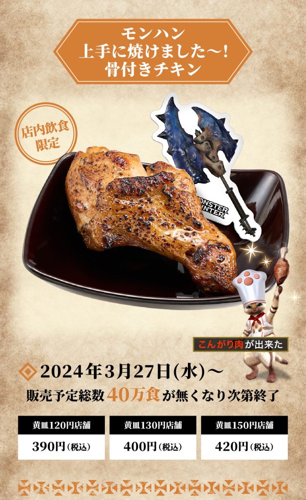 Once the campaign period has begun, Sushiro will offer three special meals on its dine-in menu while stocks last. The special sushi meals will represent carved meat and bonfires. The restaurant chain will also offer a boned chicken to symbolize Well-Done Meat in the games.