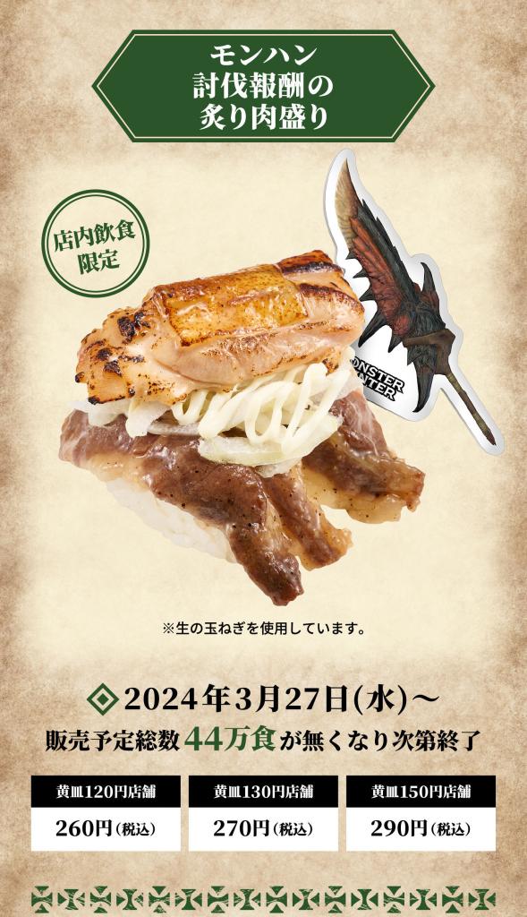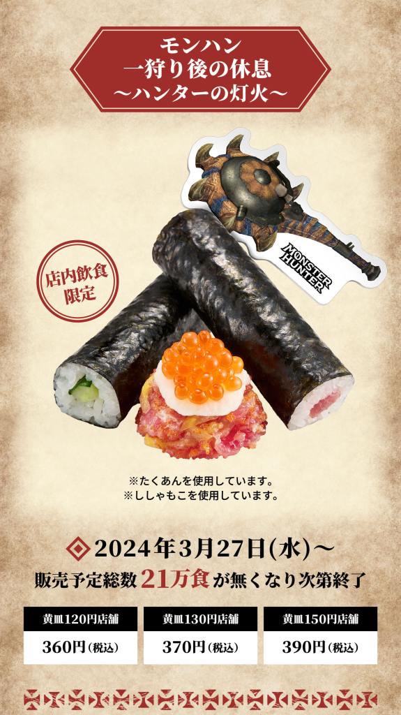 The Monster Hunter collaboration campaign will run at Sushiro dine-in branches across Japan from March 27, 2024, to April 21, 2024.