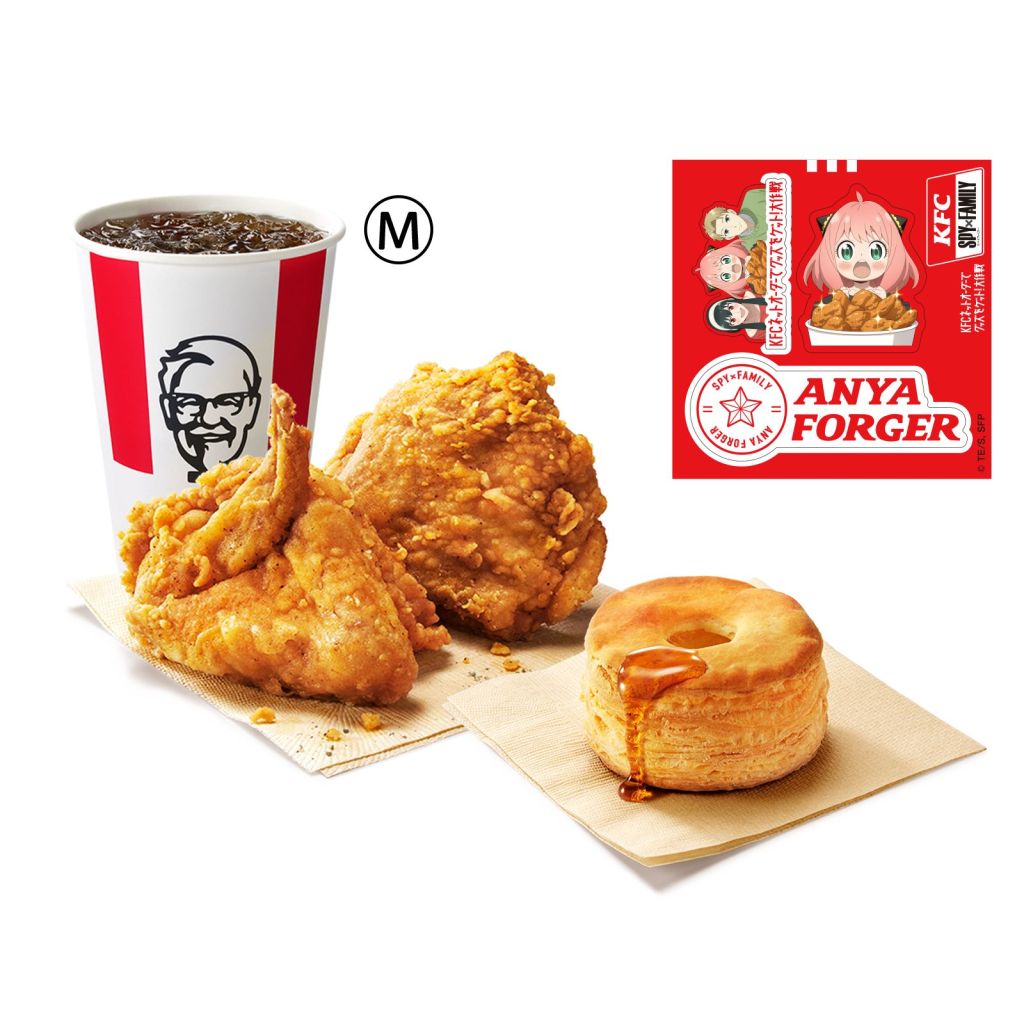 The Spy x Family Sticker Menu A costs 1,030 yen (or about $6.68,) and it includes 2 original chicken pieces, a biscuit, a medium size drink, and stickers. Meanwhile, the Spy x Family Sticker Menu B costs 850 yen (~$5.51.) Instead of the 2 pieces of original chicken, the Menu B includes a Japanese style chicken katsu burger, and the rest of the items.