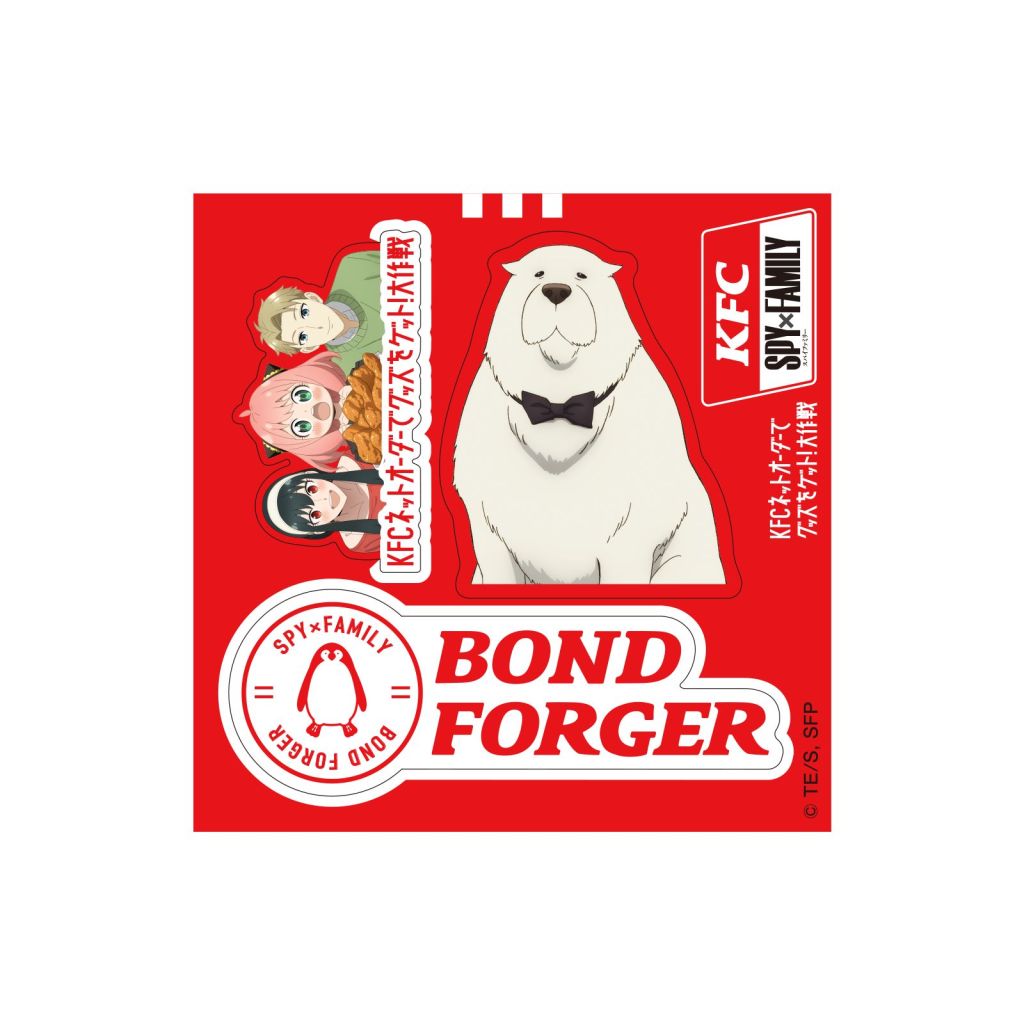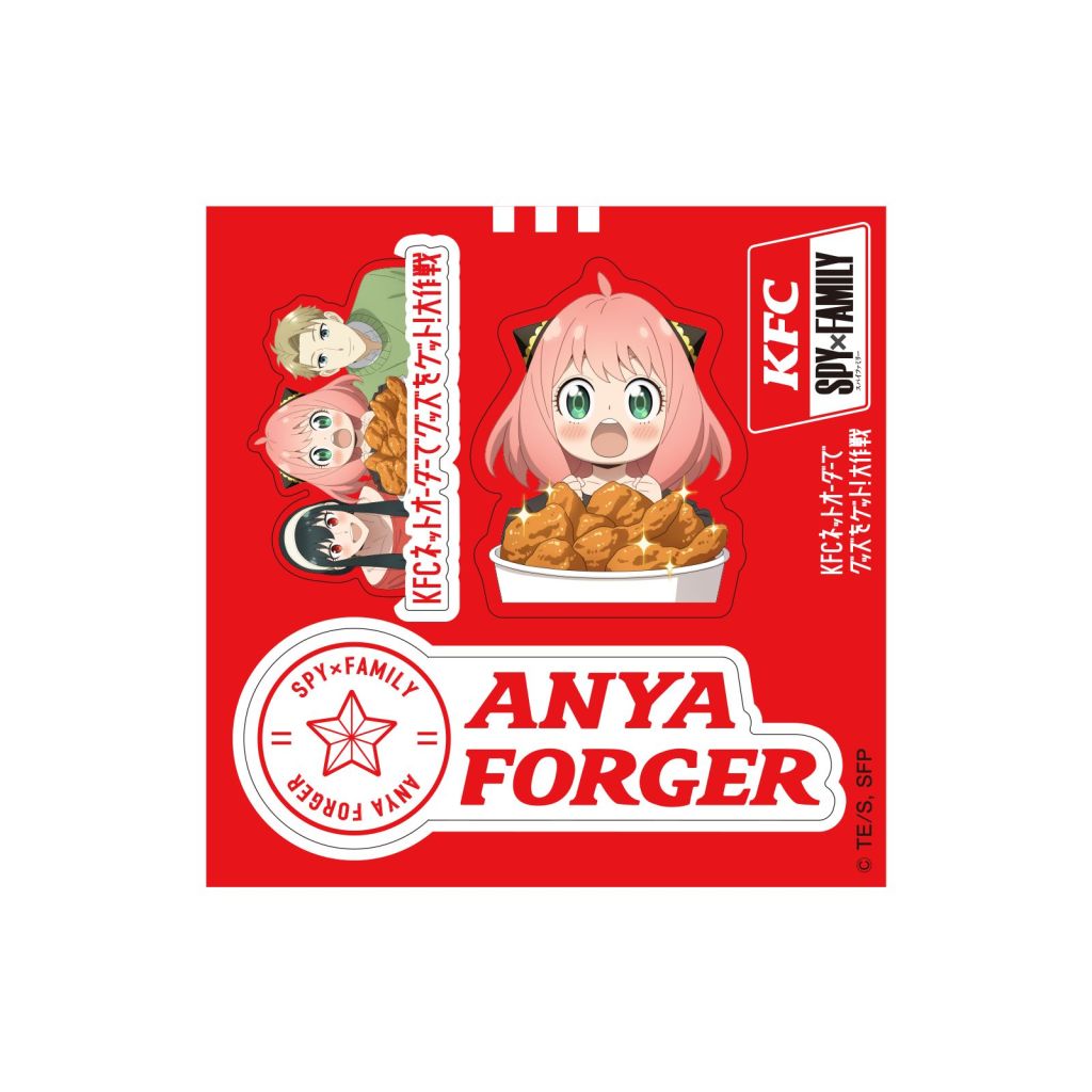 There are sticker sets for Anya, Loid, Yor, and Bond Forger, and each set features a logo with the character's name, the character holding a KFC chicken bucket, and a sticker including Anya, Loid, and Yor together. The only character that doesn't get to hold a chicken bucket is Bond.