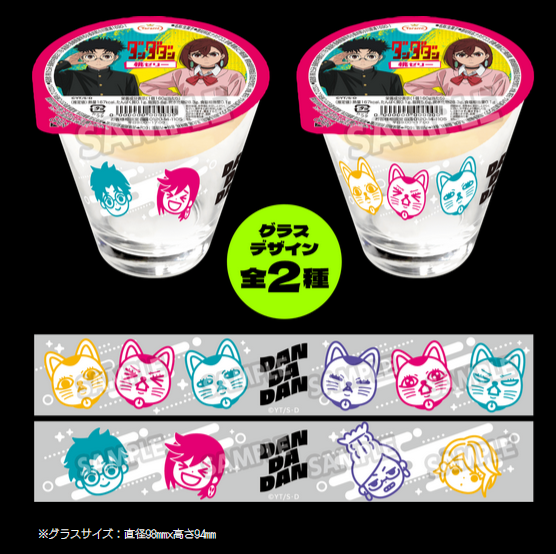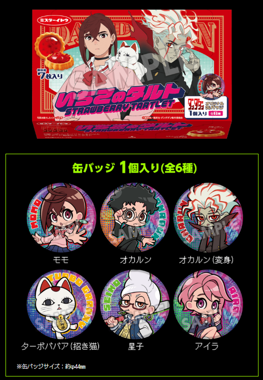 There are multiple parts to this campaign, all with different end times. Until November 25, 2024, you can get a sticker of major Dandadan characters if you purchase select snack items from participating Lawson stores. Snacks include Mentos, Meiji chocolates, and Galbo chocolates. There are also two exclusive snacks that you can buy that are special flavors for Dandadan. The peach jelly costs 919 JPY ($5.95) and there are two different designs for it. You can also purchase strawberry tartlets that cost 690 JPY ($4.45) and this comes with a random badge.