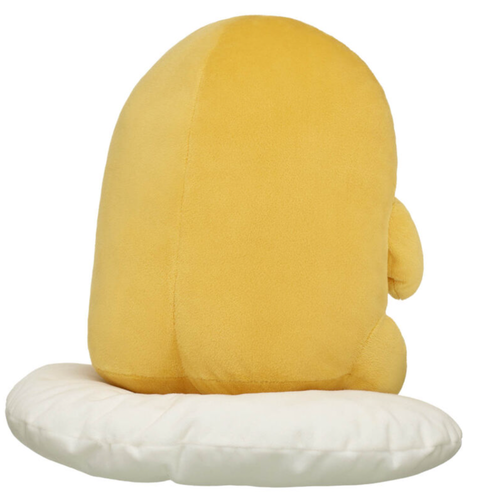 The Gudetama stuffed animal features the lazy egg sitting on an egg white. It features the character's typical "meh" expression. On the right hand, there is the Build-a-Bear paw logo. You can also remove it from the cushion to place it elsewhere. If you get it with the outfit, the hoodie is yellow with small Gudetama mascots all over it.