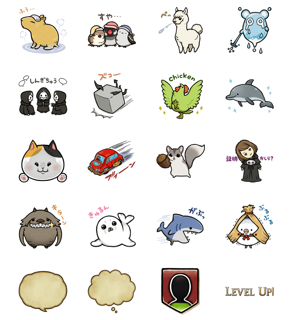 The new FFXIV LINE sticker set is the fifth pack to come out based on the online RPG, and it costs 250 yen (or about $1.69.) The set includes 40 different stickers, and some of them include captions with text in Japanese. Most of the stickers focus on Minions looking cute, emoting, or making humorous expressions. However, some miscellaneous stickers are also included such as a dialogue box, a thought bubble, a Brink of Death status effect icon, and the "Level Up!" text.
