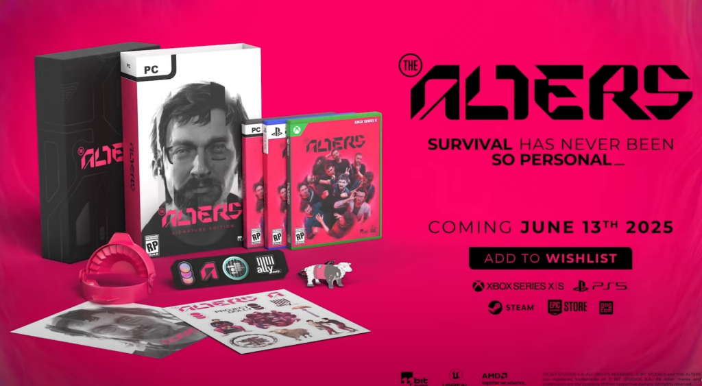 When the release date for The Alters was shown, we also got a glimpse at some apparent pre-order bonuses and real-life products that will likely be included with certain editions of the game. We can see a sticker sheet, a space lamb charm, and some pins, among other items. It also seems like there will be physical copies for all platforms, including PC.