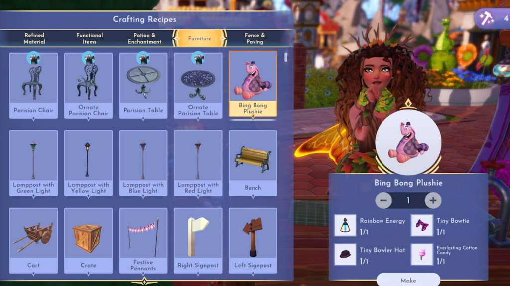 All of these materials are available within the Inside Out Realm. You can find them while progressing through the realm's storyline or return later and collect them all if you missed a few. Once you have all four materials, head to any crafting station, select the Furniture category, and choose the Bing Bong plushie to craft it.