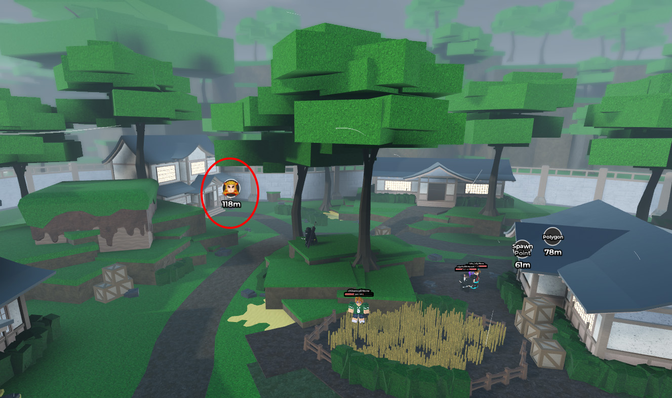 The Flame Breathing trainer is the easiest one to find since he's right near the original spawn point in the Starter Village. Just look around for the Rengoku icon. He's toward the back of the village next to a tall building.