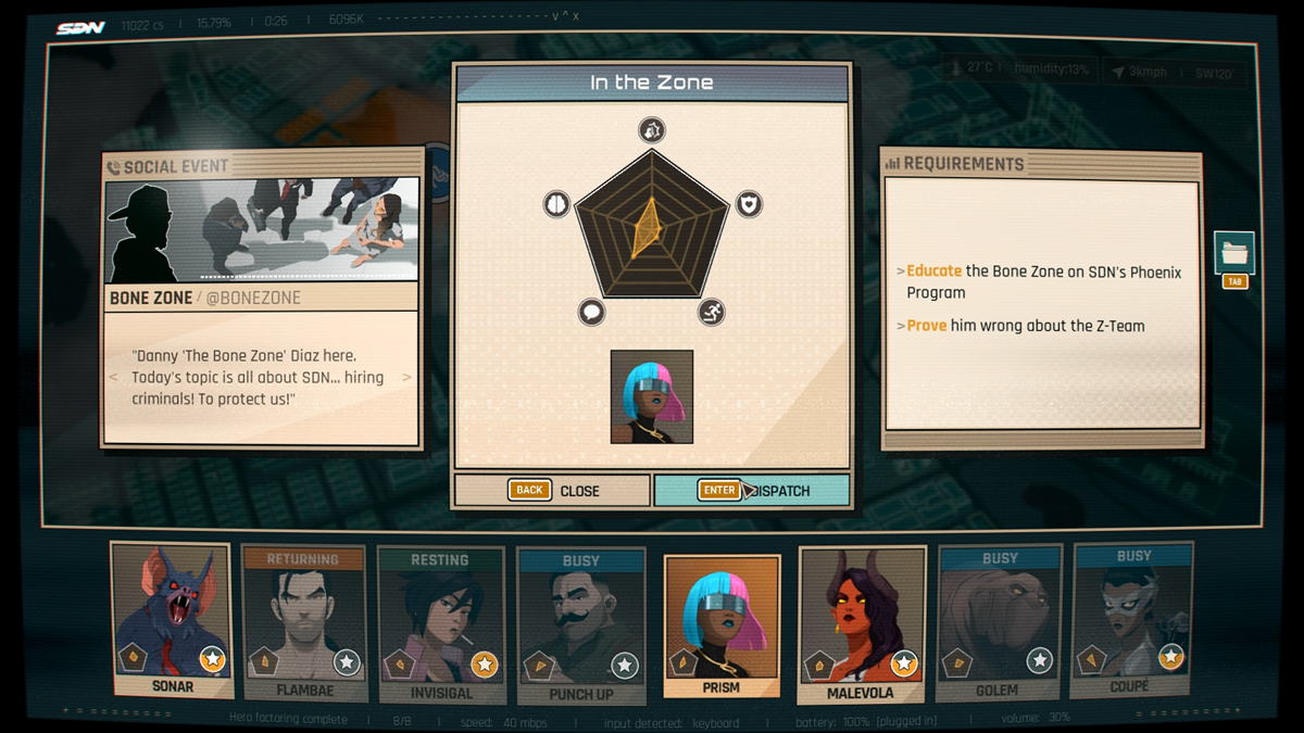 In Dispatch, we play as Robert Robertson III. He was the third Mecha Man until a fight against Shroud, his arch-nemesis who murdered his father/the second Mecha Man, went south. The Mecha Man suit was destroyed, effectively forcing him to retire. However, fellow superhero Blonde Blazer approached him with an exciting opportunity. The Superhero Dispatch Network (SDN) can help him repair the suit if he's willing to work as a dispatcher for the company.
