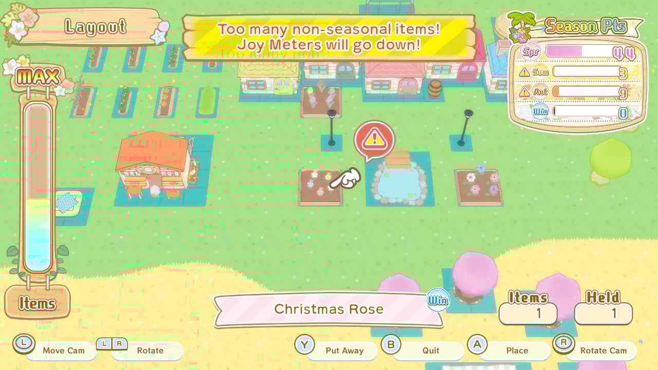 However, that lack of interactions and control, combined with the need to rearrange to suit seasons, might get a little frustrating. Days pass quite quickly in Sumikkogurashi Create a Wonderful Sumikko Island, so you probably won't get too much gathering done. While you can get away with just shifting around flowers and trees each season to meet objectives or placing a few decorations, it does feel like there's a sense of impermanence that keeps you from leaving things you set up on the fifth day of your first spring in place by the fourth day of your first summer.