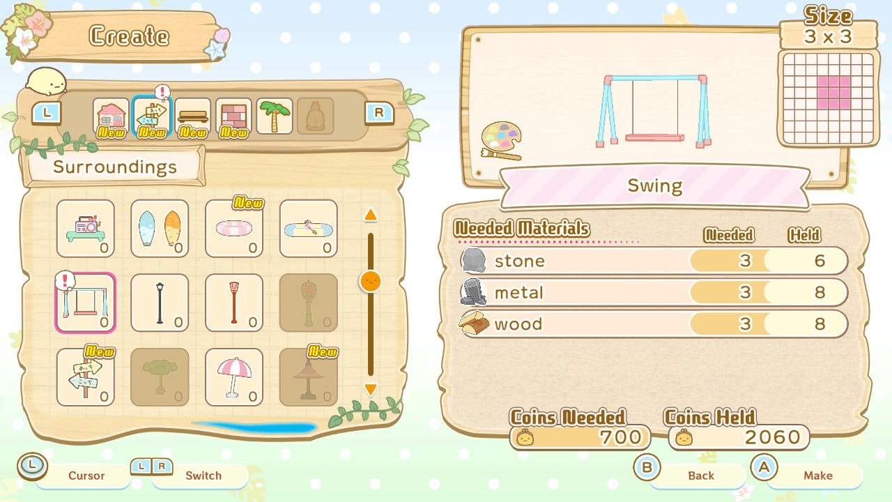 Still, there's something soothing about being an observer decorating in Sumikkogurashi Create a Wonderful Sumikko Island. The San-X mascots are adorable, and it's easy to check in the in-game index to learn about them or jump to focus on them. There are a substantial number of decorations, and we're encouraged to use a variety due to requests. There are some frustrations here, especially when it comes to gathering or needing to suit the seasons. Still, it's quite a pleasant, relaxing, and cozy little decorating game that I think fans of the characters or cute mascots in general will appreciate.