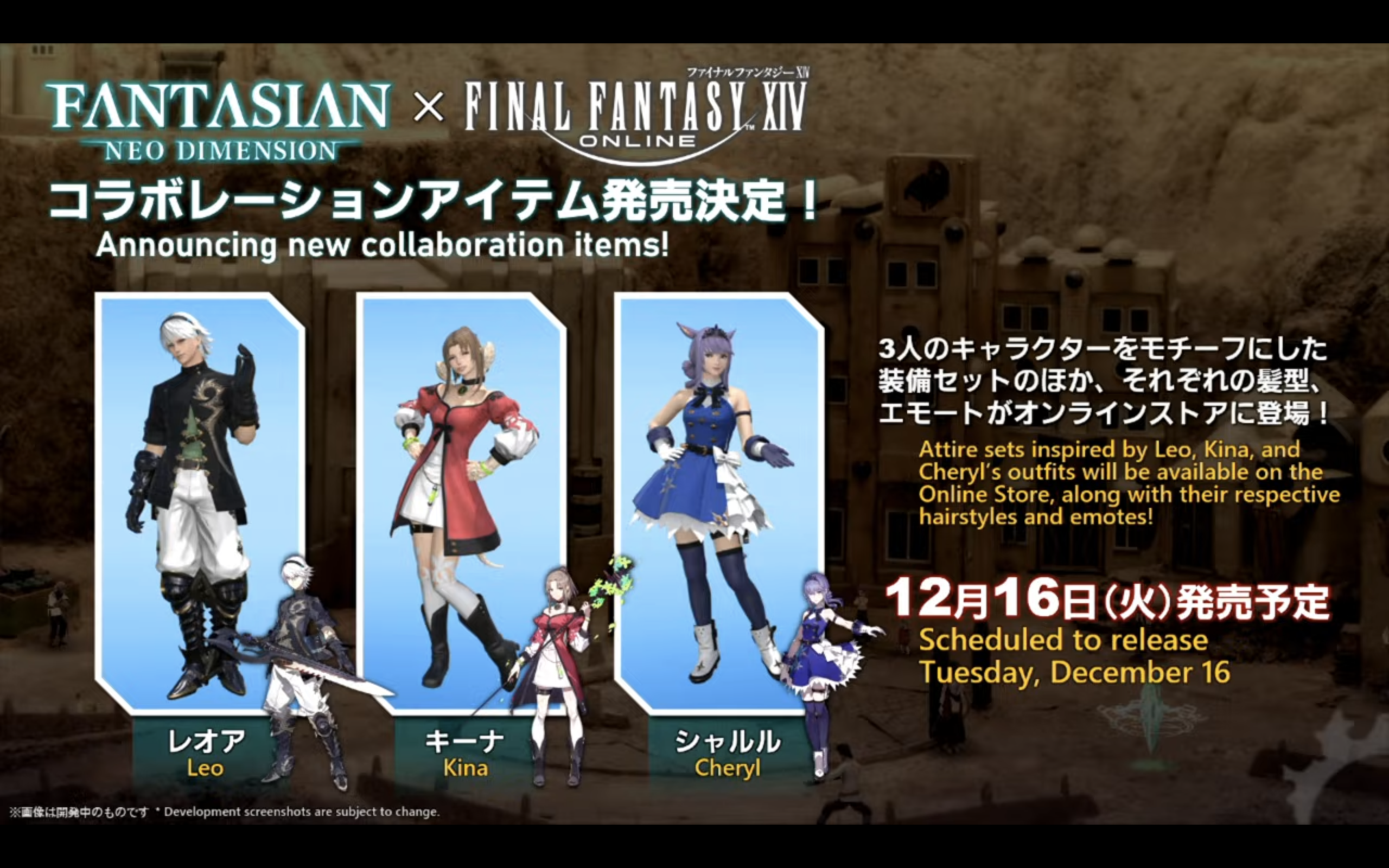 The FFXIV Fantasian Neo Dimension items will consist of three outfit sets. These will be sold in the Final Fantasy XIV Online Store, which means you will need to spend real money in order to get them. Prices weren't shared yet. The three clothing sets will be based on the costumes the leads Leo, Cheryl, and Kina will all wear in the game. No weapons are included.