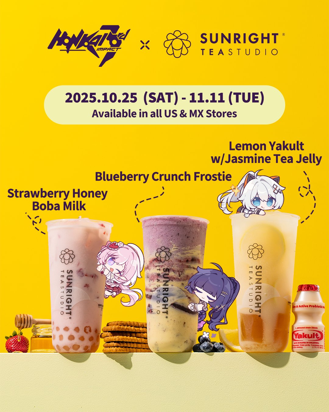 With the Honkai Impact 3rd Sunright Tea crossover, there will be three drinks inspired by Elysia, Kiana, and Mei. Here's the list of the items, as well as the official image showing how they'll look: