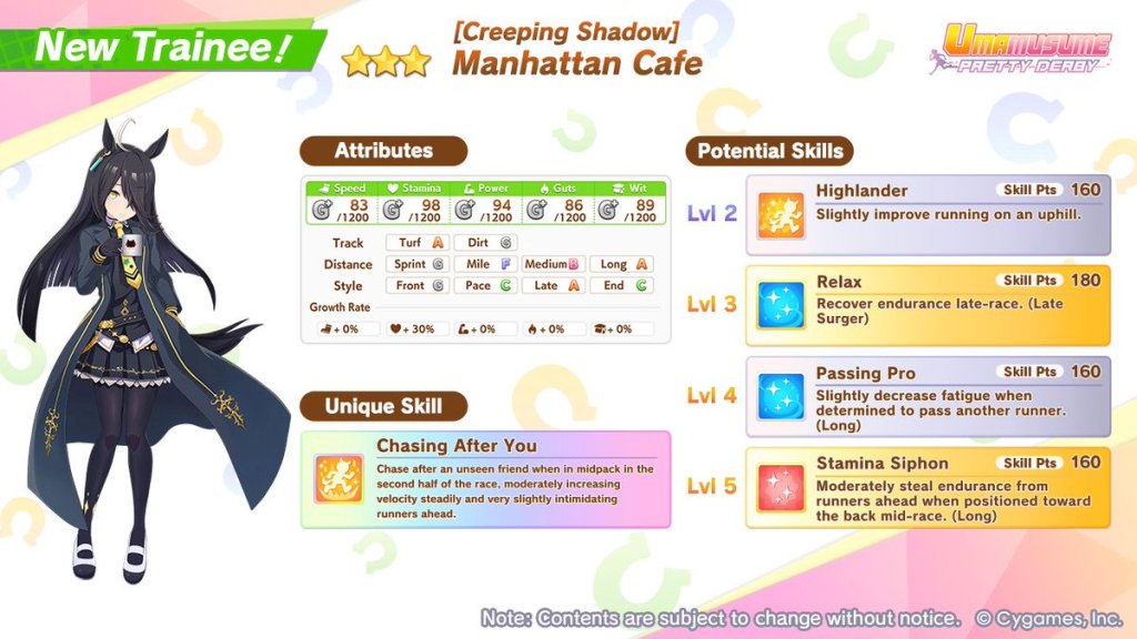 Manhattan Cafe is notable and popular in Umamusume: Pretty Derby for many reasons. One is her outfit and character design. Another is a fact that the character has an "imaginary friend" that she will talk to. She is also unusual in that her Growth Rate only gives a 30% boost to Stamina, in a nod to her love of coffee, and no other boosts to other stats. Her Unique Skill is Chasing After You, which increases her velocity while "intimidating" runners ahead of her. She also can get the Stamina Siphon skill, if you increase her potential, and the Relax and Passing pro endurance and fatigue-reducing skills.