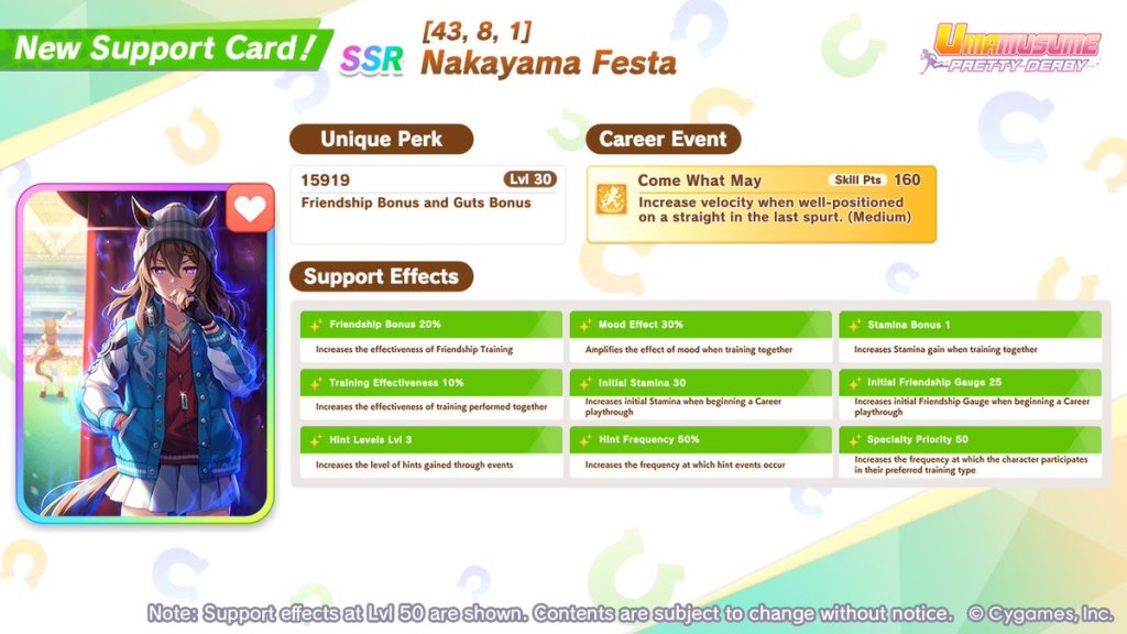 While the SSR Nakayama Festa Stamina card doesn't have a Career Event skill that restores endurance, it does feature some other notable elements. Its Career Event skill is Come What May for Medium runners to increase their velocity when "well-positioned" on a straight at the end of a race. It can also get Specialty Priority 50, to ensure the character shows up for Stamina Training, a 30% Mood Effect, a 20% Friendship Boost, and Stamina initial stat and bonus.